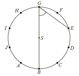 Punkty \(A, B, C, D, E, F, G, H, I, J\) dzielą okrąg o środku \(S\) na dziesięć