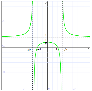 Zatem dziedzina funkcji to: \[\mathbb{R}\backslash\{-\sqrt{2},\sqrt{2}\}\]