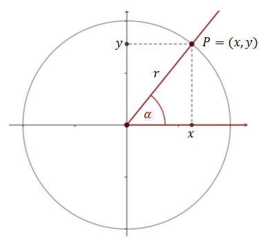 Ramię kąta \(\alpha \) wyznacza na okręgu punkt \(P=(x,y)\).
