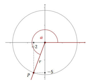 Załóżmy, że na ramieniu kąta \(\alpha \) możemy zaznaczyć punkt \(P=(-2,-5)\).