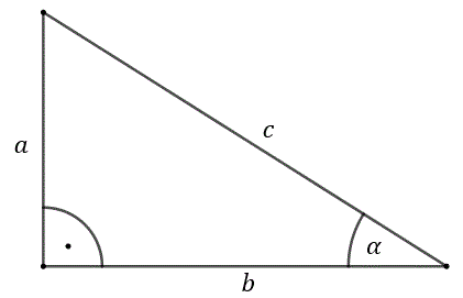 \cos \alpha =\frac{b}{c}\qquad \text{oraz}\qquad\operatorname{tg} \alpha =\frac{a}{b}\qquad