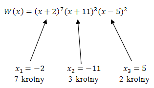 Dla wielomianu \(W(x) = (x + 2)^7(x + 11)^3(x - 5)^2\) wyznacz pierwiastki oraz ich