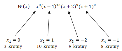 Dla wielomianu \(W(x) = x^3(x - 1)^{10}(x + 2)^9(x + 1)^8\) wyznacz pierwiastki i