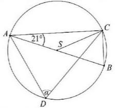 jest średnicą tego okręgu. Kąt między tą średnicą a cięciwą \( AC \) jest równy \( 21^\circ \)