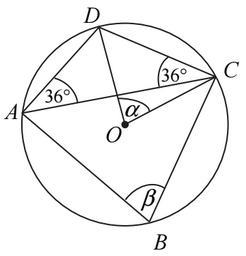 Punkty \(A\), \(B\), \(C\) i \(D\) leżą na okręgu o środku \(O\) (zobacz rysunek).