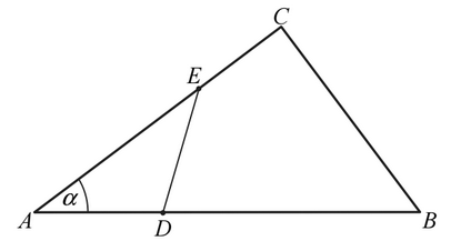 trójkąta obrano punkty odpowiednio \(D\) i \(E\) takie, że \(|BD|=2|AD|\) i \(|AE|=2|CE|\)(zobacz
