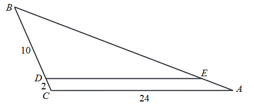 \(AB\). Odcinek \(DE\) jest równoległy do boku \(AC\), a ponadto \(|BD|=10\), \(|BC|=12\) i