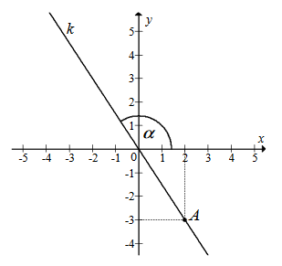 punkt \(A=(2,-3)\) i przez początek układu współrzędnych, oraz zaznaczony jest kąt \(\alpha \)