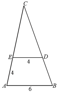 \(AC\). Odcinek \(DE\) jest równoległy do boku \(AB\), a ponadto \(|AE|=|DE|=4\), \(|AB|=6\) (zobacz