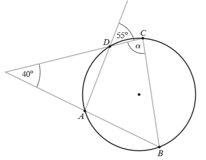 Czworokąt \(ABCD\) przedstawiony na rysunku jest wpisany w okrąg. Miara kąta