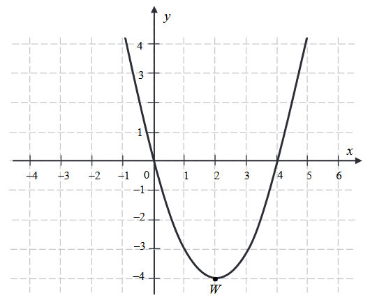 kwadratowej \(f\). Wierzchołkiem tej paraboli jest punkt \(W = (2, -4)\). Liczby \(0\) i \(4\) to