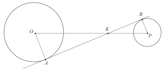 styczna do tych okręgów w punktach \(A\) i \(B\). Ponadto prosta \(AB\) przecina odcinek \(OP\) w