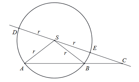 \(AB\) poza punkt \(B\) odłożono odcinek \(BC\) równy promieniowi danego okręgu. Przez punkty \(C\)