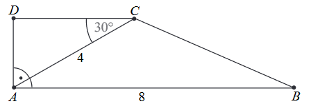 W trapezie prostokątnym \(ABCD\) dłuższa podstawa \(AB\) ma długość \(8\).