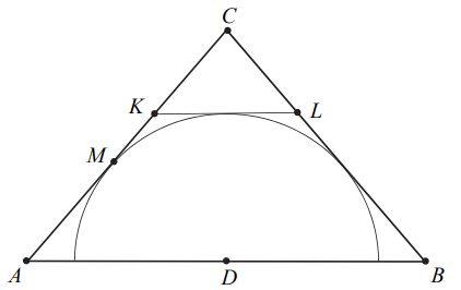 Punkt \(K\) leży na boku \(AC\), punkt \(L\) leży na boku \(BC\), odcinek \(KL\) jest styczny do
