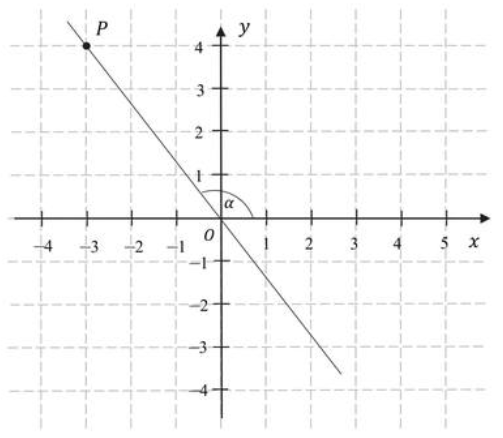 Punkty \(P = (-3, 4)\) i \(O = (0, 0)\) leżą na jednej prostej. Kąt \(\alpha \)