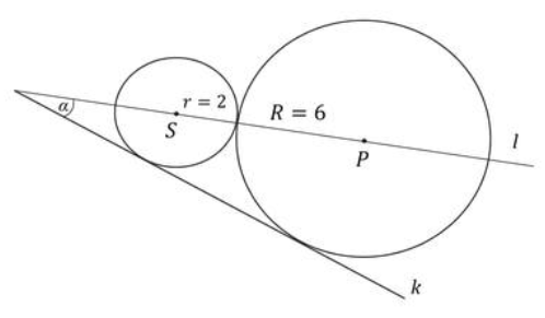okręgów przecina prostą \(k\) pod kątem \(\alpha = 30^\circ \) (zobacz rysunek).