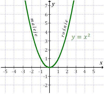 - Funkcja \(f(x) = x^2\) nie jest monotoniczna. Jest malejąca w przedziale \((-\∞