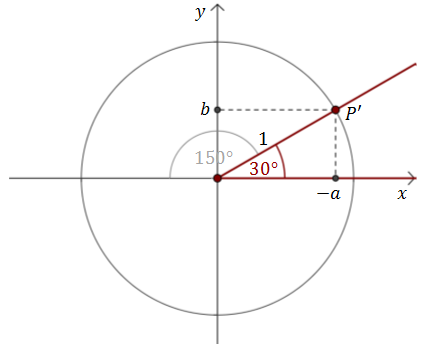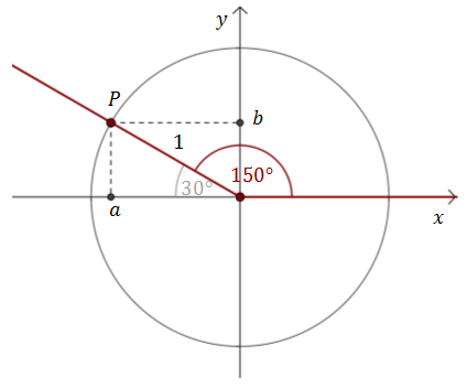 150^\circ =\frac{b}{1}=b\\[6pt]&\cos 150^\circ =\frac{a}{1}=a\\[6pt]&\operatorname{tg} 150^\circ