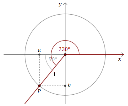 =\frac{b}{1}=b\\[6pt]&\cos 230^\circ =\frac{a}{1}=a\\[6pt]&\operatorname{tg} 230^\circ