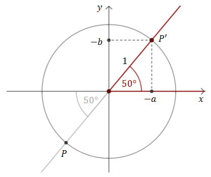 50^\circ =\frac{-b}{1}=-b\\[6pt]&\cos 50^\circ =\frac{-a}{1}=-a\\[6pt]&\operatorname{tg}