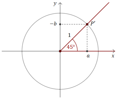=\frac{-b}{1}=-b\\[6pt]&\cos 45^\circ =\frac{a}{1}=a\\[6pt]&\operatorname{tg} 45^\circ