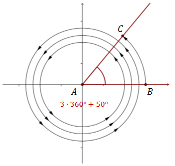 to otrzymamy kąt o mierze \(3\cdot 360^\circ +50^\circ = 1130^\circ \).
