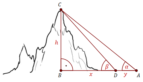 Możemy jedynie zmierzyć dowolną odległość \(AD\) u podnóża góry oraz kąty \(\alpha \text{ i