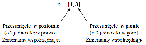 - Wektor \(\vec{v}=[-2,3]\) oznacza przesunięcie o \(2\) jednostki w lewo i \(3\) jednostki do