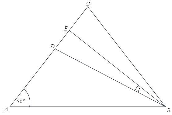\(|\sphericalangle CAB|=50^\circ \). Odcinek \(BD\) jest dwusieczną kąta \(ABC\), a odcinek \(BE\)