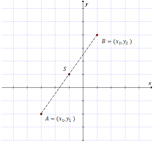 Środkiem odcinka \(AB\), gdzie \(A = (x_1, y_1)\) oraz \(B = (x_2, y_2)\) jest punkt: \[S=\left(\frac{x_1+x_2}{2}; \frac{y_1+y_2}{2}\right)\]