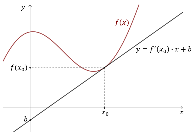 \((x_0,f(x_0))\) do równania \(y=f'(x_0)\cdot x+b\) odpowiednio pod \(x\) oraz \(y\). W ten sposób