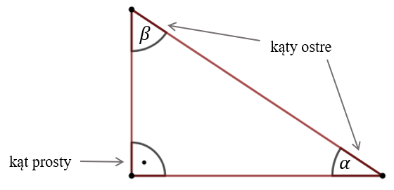 \(90^\circ \)) oraz dwa kąty ostre. Kąt prosty często oznaczamy symbolem kropki.