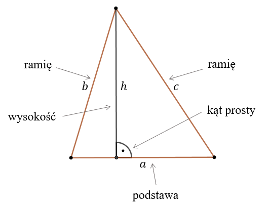 Trójkąt o podstawie \(a\), ramionach \(b\) i \(c\) oraz wysokości \(h\).