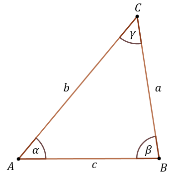 Trójkąt o wierzchołkach \(A,B,C\), bokach \(a,b,c\) i kątach wewnętrznych