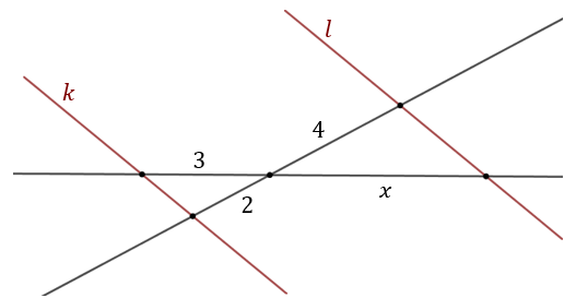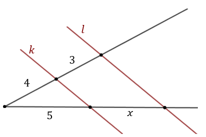 Proste \(k\) i \(l\) są równoległe. Oblicz długość odcinka \(x\).