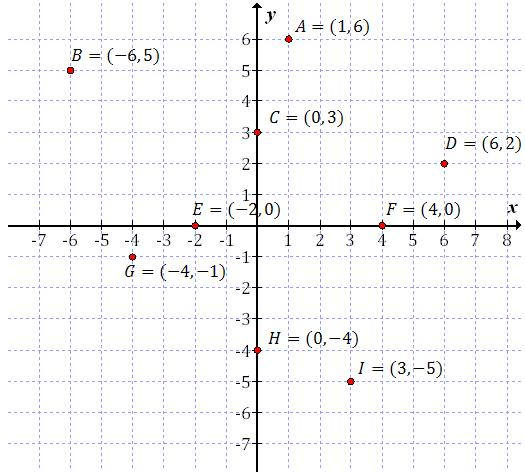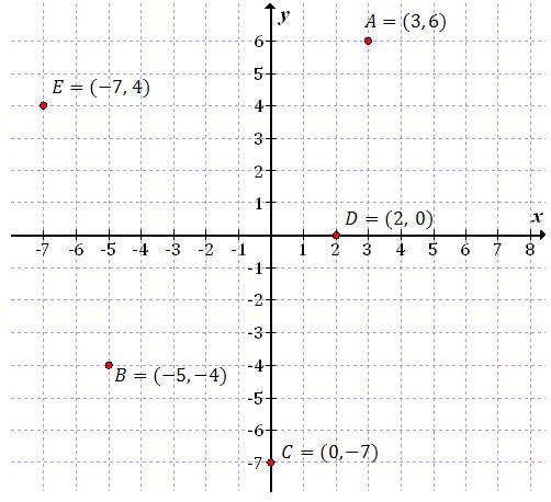 Zaznacz w układzie współrzędnych następujące punkty \(A = (3, 6)\), \(B = (-5,