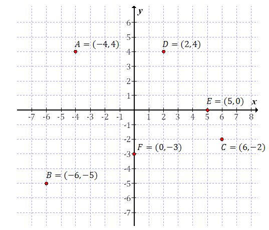 -5)\), \(C = (6, -2)\), \(D = (2, 4)\), \(E = (5, 0)\), \(F = (0, -3)\).