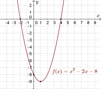 Narysuj wykres funkcji kwadratowej \(f(x) = x^2 - 2x - 8\) i omów jej własności.