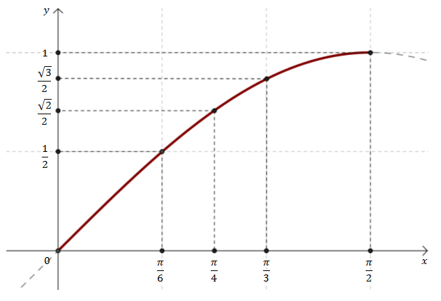 teraz dokładniej wykresowi sinusa na przedziale \(\left \langle 0, \frac{\pi }{2} \right \rangle\).