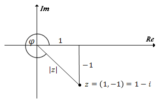 Obliczamy moduł: \[|z|=\sqrt{1^2+(-1)^2}=\sqrt{2}\] Obliczamy