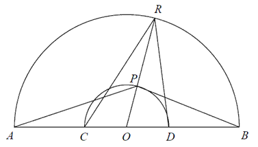 \(CD\) (punkty \(A, B, C, D\) i \(O\) są współliniowe). Punkt \(P\) leży na wewnętrznym półokręgu,