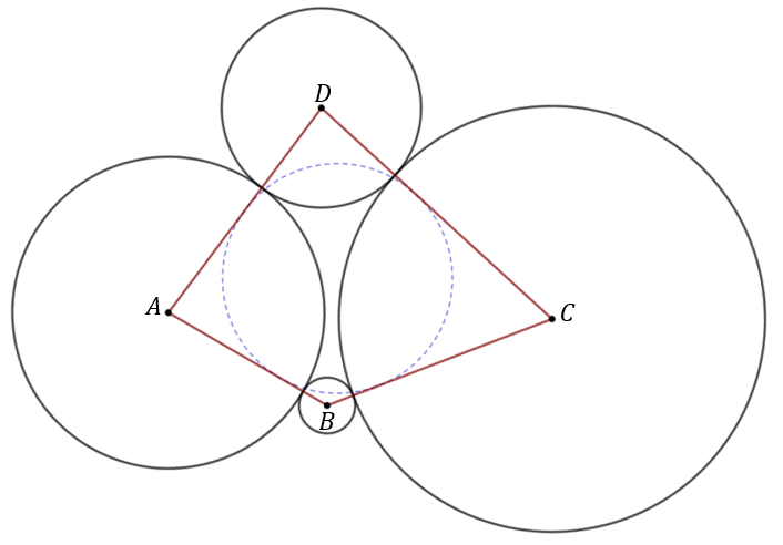 Punkty \(A, B, C\) i \(D\) to środki okręgów, które są styczne zewnętrznie, tak jak