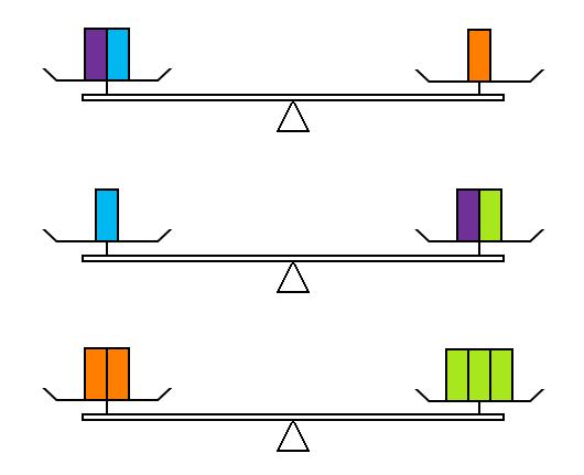 Pięć klocków fioletowych zrównoważy jeden niebieski.