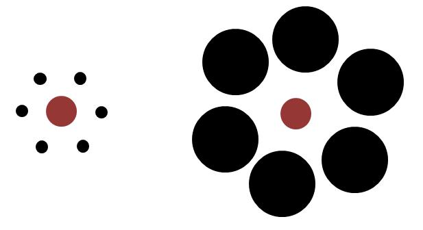 Oba czerwone koła są równej wielkości, jednak to otoczone małymi czarnymi